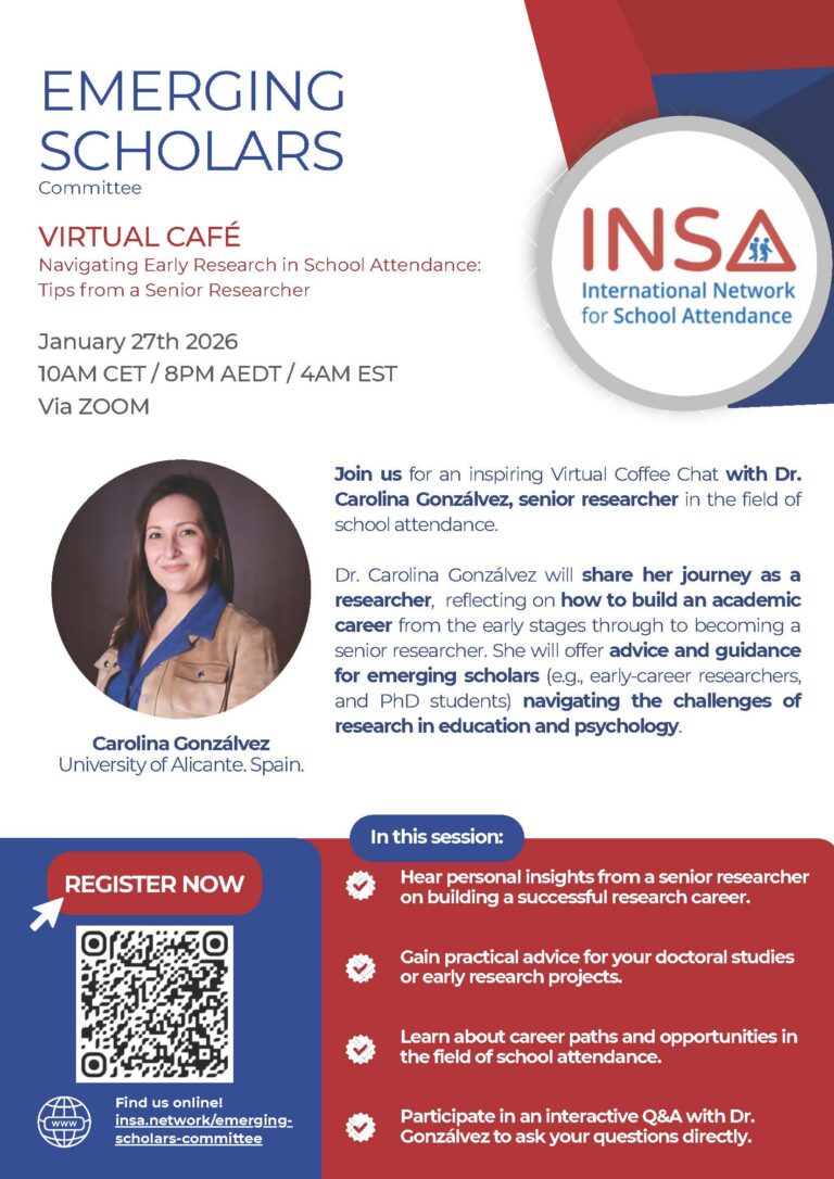 We are delighted to welcome our invited speaker, Dr. Carolina Gonzálvez, from the University of Alicante, Spain. As a professor and senior researcher in the field of school attendance, Dr. Gonzálvez will share her journey building a research career, offering tips, guidance, and advice for emerging scholars navigating the challenges of research.
